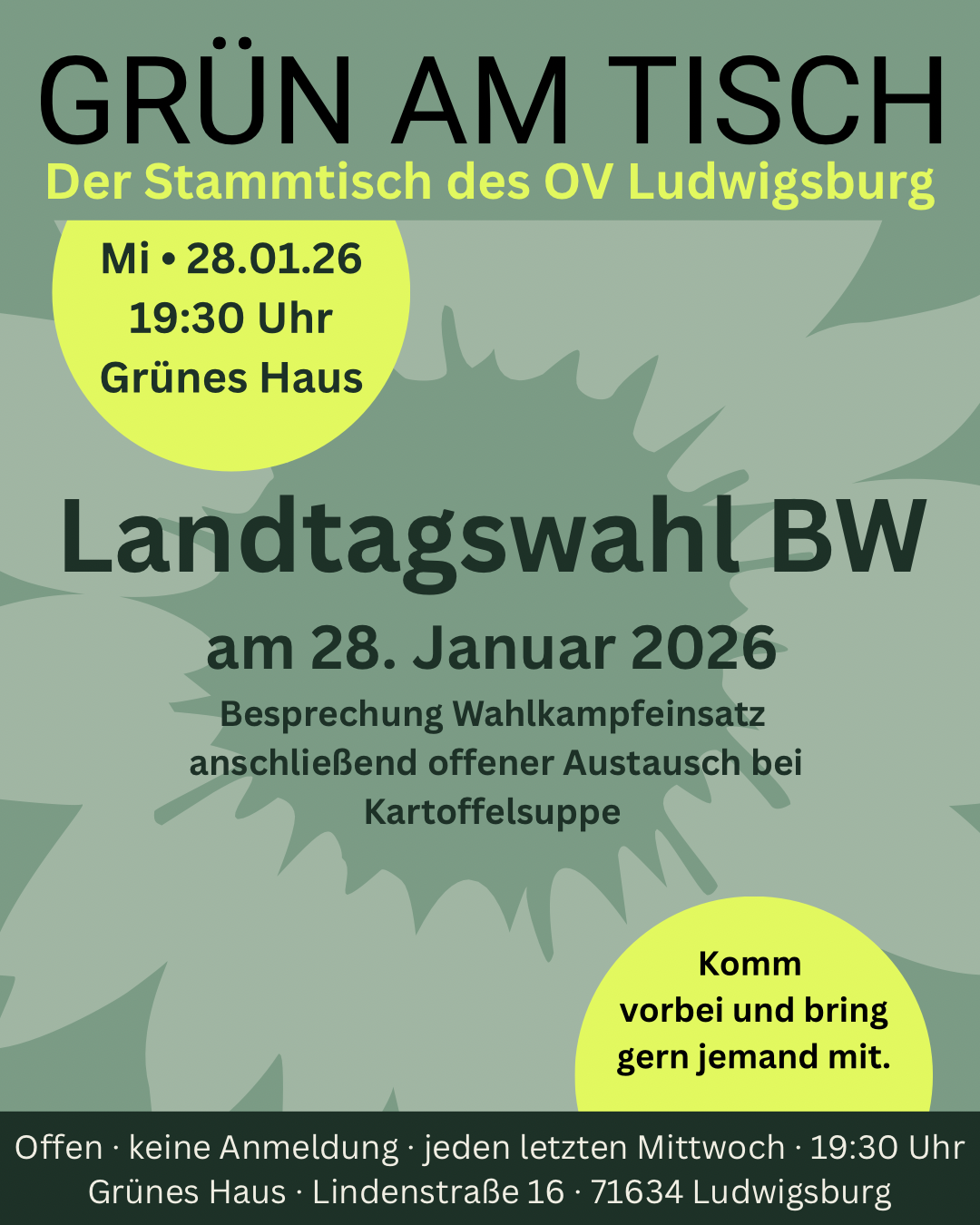 Unser Stammtisch findet jeden letzten Mittwoch im Monat um 19:30 Uhr statt. Komm einfach im Grünen Haus in Ludwigsburg vorbei.